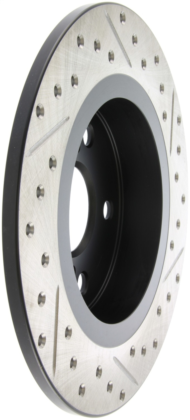 StopTech Drilled and Slotted Sport Rotors are 1-piece direct replacement brake discs for factory brake systems and stock calipers that look great behind your wheels – and offer significantly improved braking performance. The unique cross-drilling and slotting aids with heat and brake dust dispersal, prevents glazing of the pads, adds bite and improves wet and dry braking performance. Built to last, the black e-coating provides protection from corrosion and the high carbon metallurgy (in most applications) offers quieter operation, better crack resistance and increased performance.